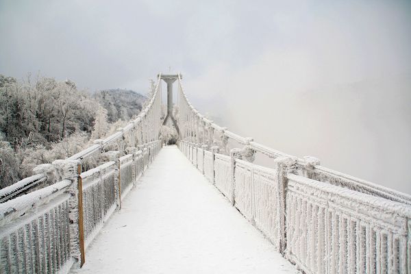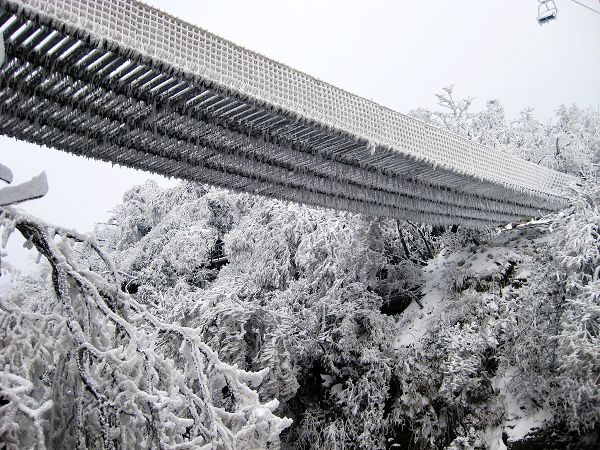 由于淡季,不用排隊(duì)很快坐上了索道,前前后后的轎廂內(nèi)都沒人,俺倆坐著好不優(yōu)哉。索道漸次翻越而后陡然爬升,進(jìn)入乳白色的氤氳之中,最后全被濃厚的霧氣包裹,像在云霧中漂移。俺又爽又驚,心想神仙還真不是好當(dāng)?shù)摹?粗懊娴牟僮髡f明:沒事,這個(gè)挺先進(jìn)的,碰到惡劣天氣會(huì)自動(dòng)停止運(yùn)行。話音剛落,它就停了,然后左右左右的晃啊晃啊。俺顫顫地問:怕嗎?他說:嗯……還,還成。俺喃喃地道:靠,俺可不想死呢……終于正襟危坐地熬過了那幾分鐘的晃悠,繼續(xù)上行后,霧氣淡了許多,這才看到索道支架和輪軌竟然都凍上厚厚的冰掛。心肝一顫:不是吧,這是到哪了???!