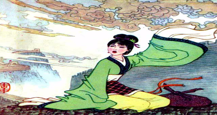 相傳嘉山腳下有一姜姓老者,生有一女,取名孟姜。孟姜成人后,一日在屋后小池塘里洗澡,被逃長(zhǎng)城役而路過此地的范喜郎偷窺。兩人一見傾心,私訂終身。不想新婚燕爾,范喜郎還是被官府抓走,押送邊關(guān)修筑長(zhǎng)城。由于不堪重勞,范喜郎很快死去,并被填埋在長(zhǎng)城之下。孟姜在家天天望夫歸來(lái)。過數(shù)年,孟姜決心親往長(zhǎng)城尋覓,哭倒長(zhǎng)城,獲夫骸骨,背負(fù)還鄉(xiāng),死于返鄉(xiāng)途中。鄉(xiāng)人感其事跡,修廟供奉不絕。