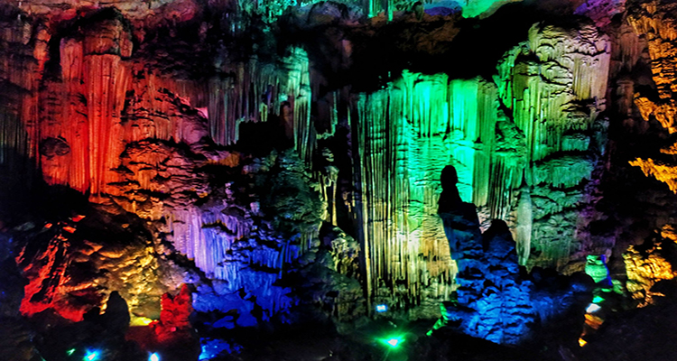 一個(gè)巨大的喀斯特溶洞,位于湖心島上。洞內(nèi)空間開闊,鐘乳石形態(tài)各異,在五彩燈光的映襯下,呈現(xiàn)出光怪陸離的景象,仿佛進(jìn)入了一個(gè)神秘的地下世界。洞內(nèi)還有地下河,河水清澈見底。需乘船抵達(dá)島上,游覽時(shí)間約 1 小時(shí),參觀時(shí)需跟隨導(dǎo)游,注意安全。