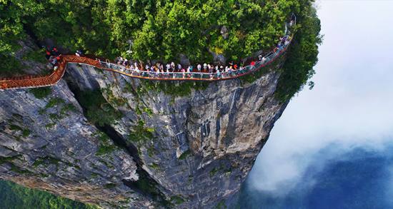 棧道全長1600米,平均海拔為1400米,起點是倚虹關(guān),終點到小天門。與其他棧道不同的是,鬼谷棧道全線既不在懸崖之巔,也不在懸崖之側(cè),而是全線都立于萬丈懸崖的中間,給人以與懸崖共起伏同屈伸的感覺。 站在棧道上俯瞰群山,古人“會當凌絕頂,一覽眾山小”的感覺油然而生。由于天門山是國家森林公園,植被特別豐富,加上典型的喀斯特地貌,所以,在這條棧道上更能找到一種在乘坐直升飛機飛越熱帶雨林大峽谷的感覺,這平時只能在電影里看到的場景,在這里能讓你身臨其境。 由于海拔和氣流的影響,很多小鳥都不能到達與棧道平行位置。所以,站在這里,腳下是沒有邊際的綠野,成群的小鳥在峽谷中嬉戲,偶爾有老鷹從眼前掠過,閉上眼,挺著發(fā)麻的雙腿,帶著急促的心跳,伸開雙臂,你就能得到一次最完美、最刺激、最貼近自然的SPA。因為,要知道這種在懸崖上賞風(fēng)景一般都是非人類所能享受的。 如果是雨前雨后,在棧道上則是身邊霧氣盤繞,腳下云海翻騰,令人抬腿似生霧,邁步如踏云,人間天界,世外洞天也就是如此了。 據(jù)施工人員介紹,此條棧道也是他們所修棧道中施工最難,最險峻的一條。如果您還覺得不夠刺激的話,在棧道的完結(jié)處的兩個懸崖之間有一條長160米的懸索吊橋,同時,在海拔最高點還有一個挑戰(zhàn)心里極限的玻璃站臺,在這里,如果你能挺直腰板伸開雙臂,那么,您就是真正的勇士了。