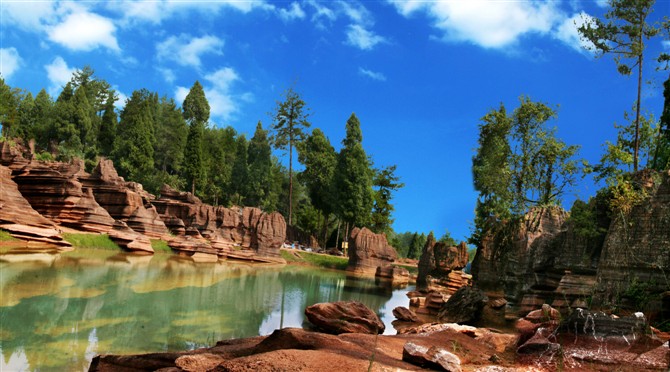 據(jù)地質(zhì)專家考證:紅色石林巖石形成的歷史約4。5億年,地質(zhì)史上稱之為揚子古海(海底沉積了大量混合泥沙的碳酸鹽物質(zhì),經(jīng)地殼運動和侵蝕、溶蝕作用形成了這片美麗的地質(zhì)奇觀)。景區(qū)內(nèi)遍布高大奇石,造型各異、顏色變化多端,且隨天氣、時間、季節(jié)變化而變化,晴紅雨黑、陰轉(zhuǎn)褐紅、晨昏有別。 景區(qū)內(nèi)石景有:蜀犬吠日、乳燕待哺、樓蘭古城、蝸牛搬家、七彩迷宮、利劍刺空、航母巡游、石兵列陣、少女出浴、觀音坐蓮、石鞭候主、靈龜探海、粽熊迎客、天狗吠日、水獺望云、母雞搗窩、駝鈴聲聲····尤以“巨人圓”、“古城故宮”、“八卦奇陣”、“諸葛藏書”為奇石絕景中的最佳。 景區(qū)內(nèi)還有地下溶洞、絕壁天坑、神秘地坑、千年古木、土家山寨、土風民俗、集商遺址····