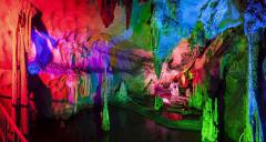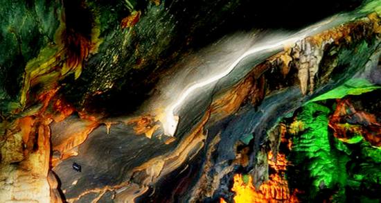 洞內(nèi)寬大幽深,洞中有洞,樓上藏樓,鐘乳石千姿百態(tài)、三步一景、五步一閣,萬千景象,令人嘆為觀止,有南宮、北宮、瑤池仙境、海底世界等四大景區(qū)、10多個廳堂,100多個景點。